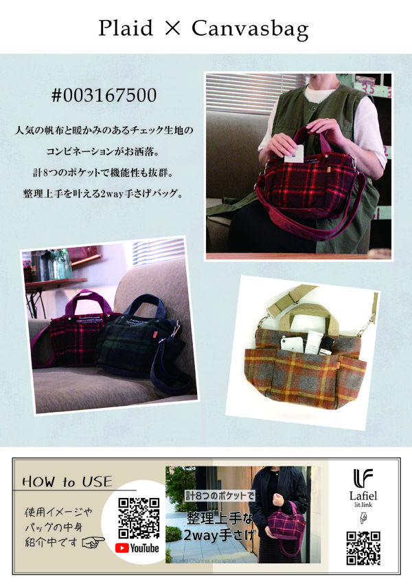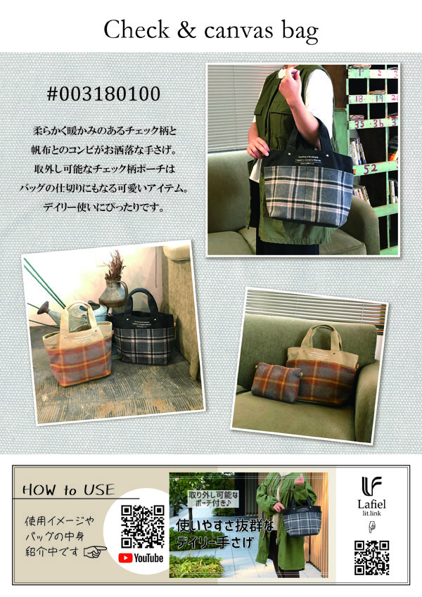 人気の帆布生地と柔らかな風合いで暖かみのあるチェック生地のコンビネーションがお洒落な雰囲気。